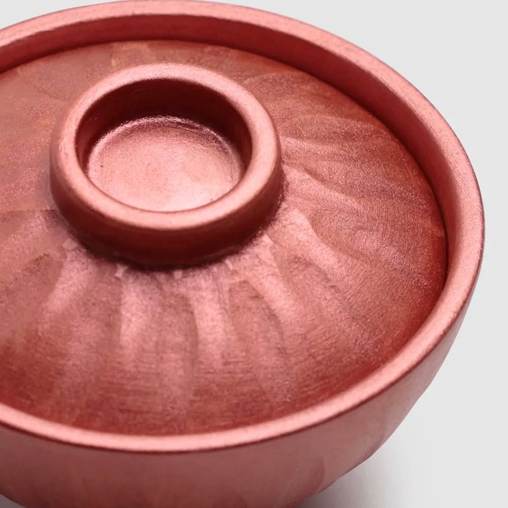 貝山窯の豆ちゃわんは花弁がモチーフ。表面の凹凸は一つひとつ手彫りで、味がある表情を見せています。彫を施したあとに一度焼成し、固くなった生地を回しながら巻くように赤絵を筆で塗り、もう一度本焼成をすることで、ようやく完成となります。