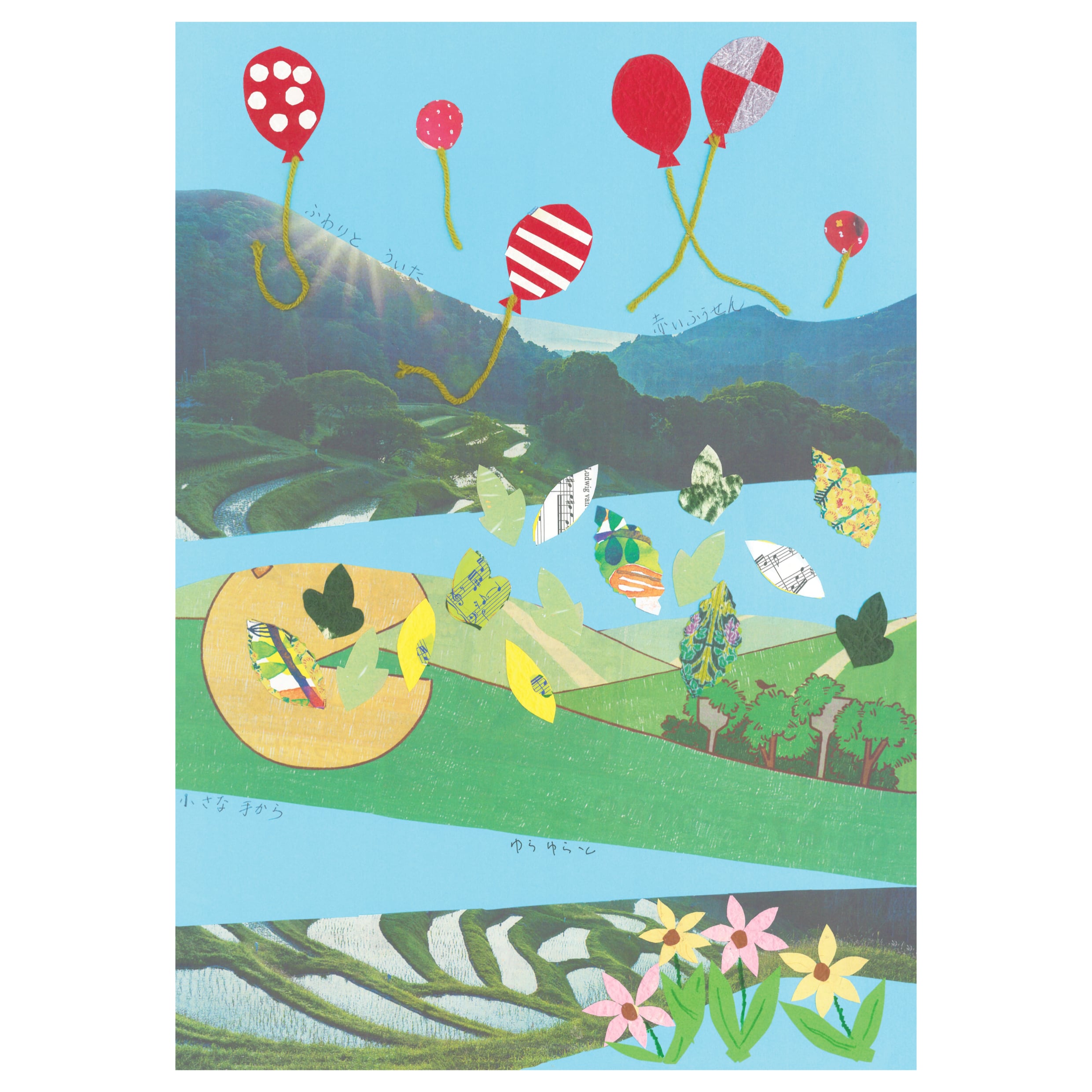 緑の棚田、光る木の葉、子供たちの笑顔、風と共に空に舞い上がる赤い風船。